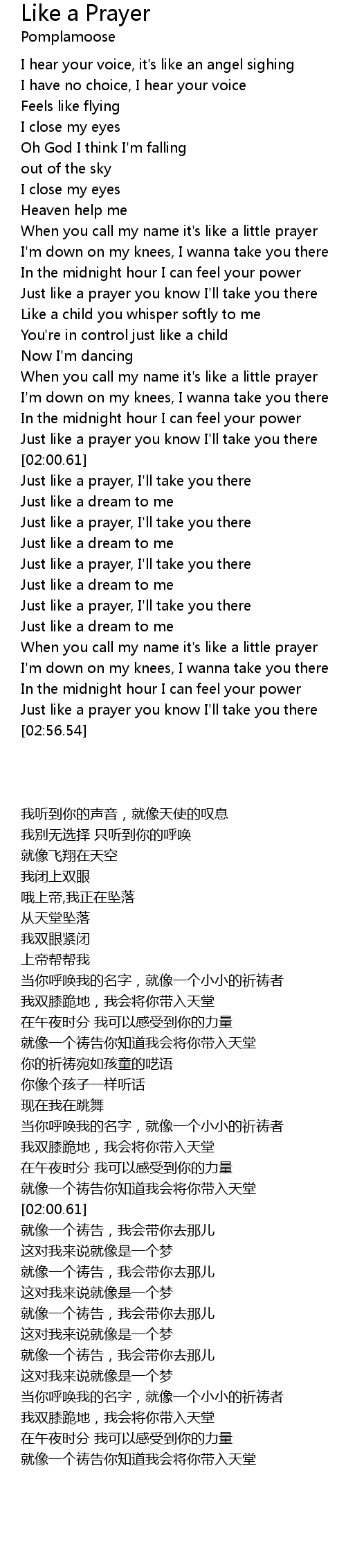 Madonna - Like A Prayer - 1989 - Track 01 Hope Youtube won't delete it again... Life is a mystery, everyone must stand alone I hear you call my name And it feels like home When you call my name it's like a little prayer I'm down on my knees, I wanna take you there In the midnight hour I can feel your power Just like a prayer you know I'll take you there I hear your voice, it's like an angel sighing I have no choice, I hear your voice Feels like flying I close my eyes, oh God I think I'm falling Out of the sky, I close my eyes Heaven help me When you call my name it's like a little prayer I'm down on my knees, I wanna take you there In the midnight hour I can feel your power Just like a prayer you know I'll take you there Like a child you whisper softly to me You're in control just like a child Now I'm dancing It's like a dream, no end and no beginning You're here with me, it's like a dream Let the choir sing When you call my name it's like a little prayer I'm down on my knees, I wanna take you there In the midnight hour I can feel your power Just like a prayer you know I'll take you there When you call my name it's like a little prayer I'm down on my knees, I wanna take you there In the midnight hour I can feel a power Just like a prayer you know I'll take you there Life is a mystery, everyone must stand alone I hear you call my name And it feels like home Just like a prayer, your voice can take me there Just like a muse to me, you are a mystery Just like a dream, you are not what you seem Just like a prayer, no choice your voice can take me there Just like a prayer, I'll take you there It's like a dream to me Just like a prayer, I'll take you there It's like a dream to me Just like a prayer, I'll take you there It's like a dream to me Just like a prayer, I'll take you there It's like a dream to me Just like a prayer, your voice can take me there Just like a muse to me, you are a mystery Just like a dream, you are not what you seem Just like a prayer, no choice your voice can take me there Just like a prayer, I'll take you there It's like a dream to me Just like a prayer, I'll take you there It's like a dream to me Just like a prayer, I'll take you there It's like a dream to me Just like a prayer, I'll take you there It's like a dream to me Just like a prayer, I'll take you there Just like a prayer, I'll take you there Just like a prayer, I'll take you there Just like a prayer